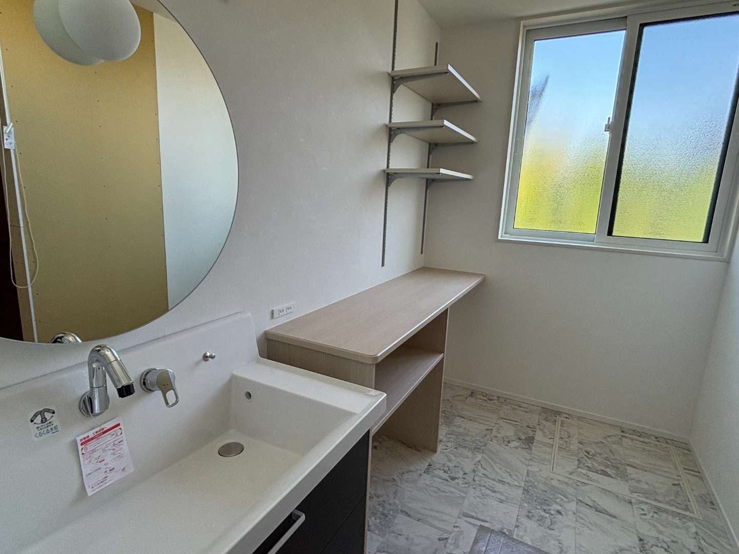 次は洗面所です。明るさと広さに驚きました😲洗濯物をたたんだりもできる作業スペース、収納もたくさん♪