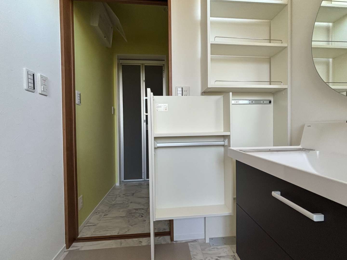 洗面台脇から出てくる収納スペース😲ストックがたくさん置けて、一目で何があるのかないのかわかります。お子さまでも取りやすくていいですね♪