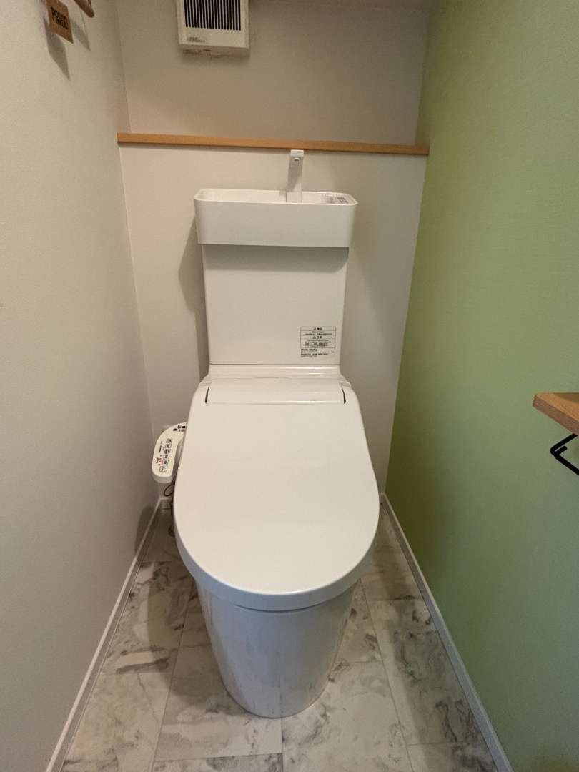 トイレもお洒落で素敵です✨壁紙のグリーンと白、床とのコントラスト、N様のこだわりを感じます!