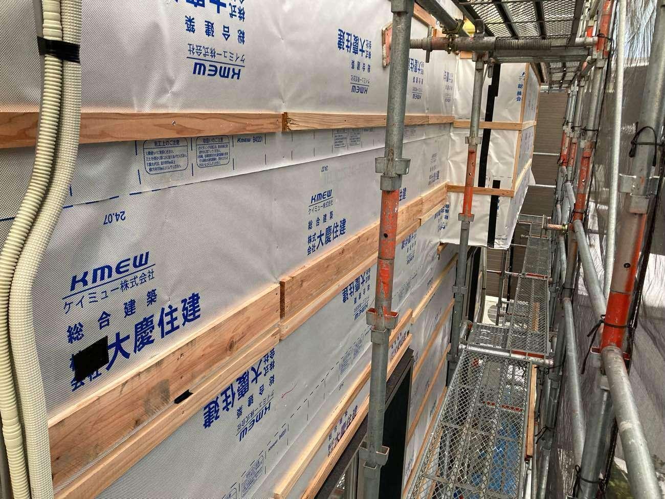 雨水の侵入防止、湿気の排出、耐久性向上などのための透湿防水シート。壁の中で見えなくなってしまいますがとても大事なものですね!
